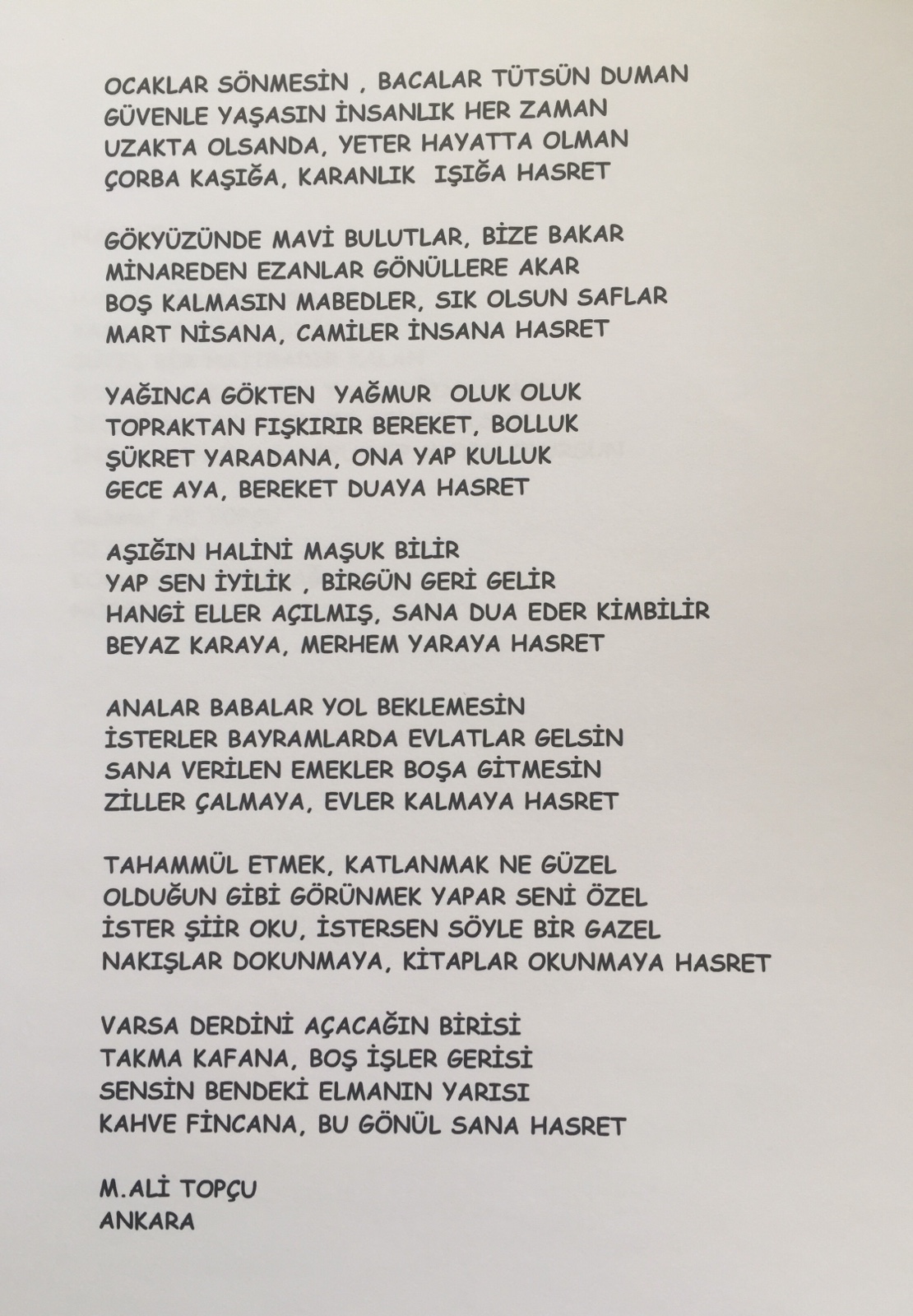 HASRET Yazan:M.Ali TOPÇU13 Nisan 2020Yazı kategorisi Genel Bunu paylaş: WhatsApp'ta paylaş (Yeni pencerede açılır) WhatsApp Arkadaşınıza e-posta ile bağlantı gönderin (Yeni pencerede açılır) E-posta Facebook üzerinde paylaş (Yeni pencerede açılır) Facebook Beğen Yükleniyor... İlgili M.Ali TOPÇU tarafından yayımlandı Kah gezerim eller gibi Kah eserim yeller gibi Alır başımı giderim Özgür kuşlar gibi I walk around like hands My work is like a wind I'll take my head Like free birds Daha fazla yazı görüntüle