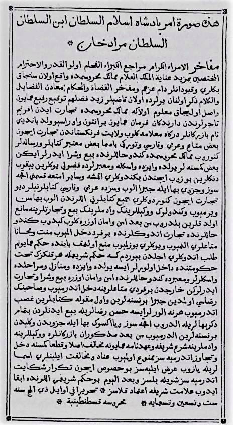 Avrupa matbaalarında basılan kitapların Osmanlı sınırları içinde satışına izin verildiğine dair Sultan III. Murad’ın 1588’de neşrettiği ferman (Nasiruddin Tusi’nin, “Tahrîru Usûlü’l-Hendese” adlı geometri kitabının giriş kısmında basılmıştır)