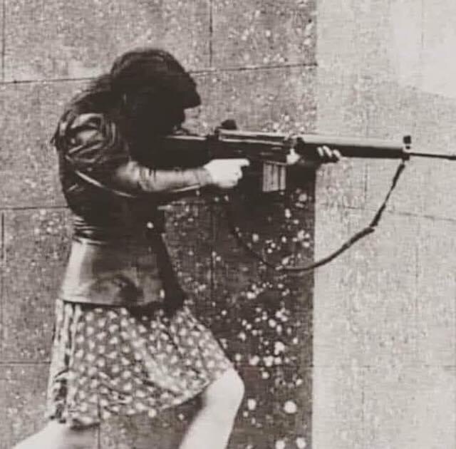 İngiliz ordusuna karşı bir savaşta yaralanan nişanlısının silahıyla ateş eden bir kadının 1972’de İrlanda’da çekilen bir fotoğrafı.
