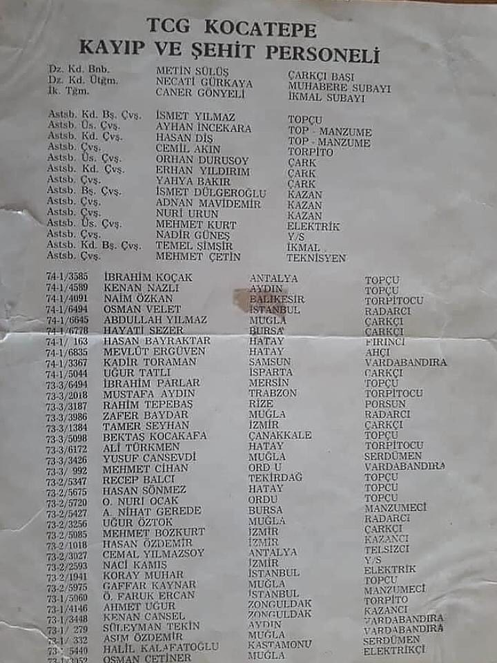Daha sonra eve geldiğimde Kocatepe’nin kaybı sebebiyle komşularımızın ve tanıdıklarımızın baş sağlığı dilemeleri beni çok duygulandırmıştı. Demek ki bahriye artık benim ikinci ailemdi. Sonraları gerek Kıbrıs ve gerekse Kocatepe hadisesi meslek hayatım boyunca her zaman ilgilendiğim, ders çıkardığım, çıkardığım dersler paralelinde fikir ürettiğim bir konu oldu.