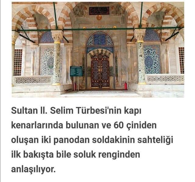 Sultan ll. Selim Türbesi’nin kapı kenarlarında bulunan ve 60 çiniden oluşan iki panodan soldakinin sahteliği ilk bakışta bile soluk renginden anlaşılıyor.