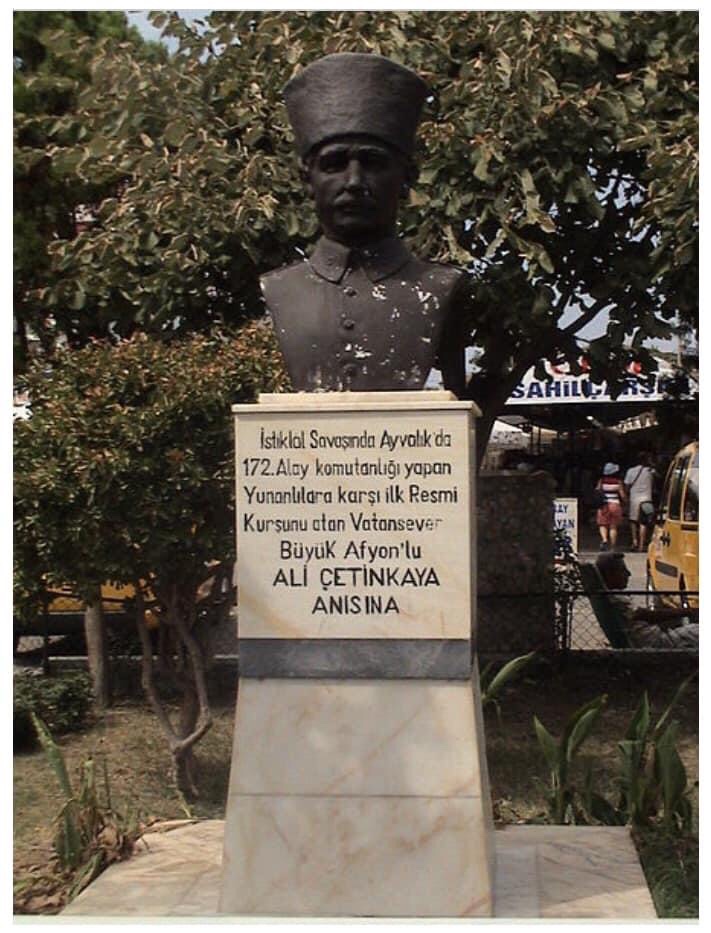 Yunan ordusu Anadolu’ya çıktıktan sonra ilk direnişle Ayvalık’ta karşılaşmış, Kurtuluş Savaşının ilk kurşunu Yarbay Ali Çetinkaya tarafından Ayvalık’ta atılmıştır. Bu çatışmada İnzibat Bölüğü komutanı Üsteğmen Fahri Bey şehit olmuştur. Günümüzde o çarpışmanın ve şehitlerin aziz hatırlarını ebedileştirmek amacıyla kent meydanında Atatürk Anıtı Kompozisyonu içinde rölyef halinde “İlk Kurşun Anıtı” inşa edilmiştir. Üç buçuk yıl (39 ay 16 gün) düşman işgalinde kalan Ayvalık 15 Eylül 1922 yılında tekrar Türk egemenliğine girmiştir. Cunda Adasına Cumhuriyet döneminde Ali Çetinkaya’nın anısına Ali Bey Adası ismi verilmiştir.