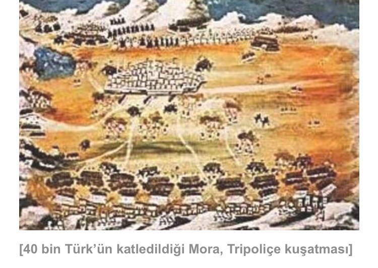“Tarihin en büyük katliamlarından birinin eşiğinde olan Mora’daki Tripoliçe şehri, 5 ay boyunca 50–60 bin Rum tarafından aralıksız kuşatıldı. Rum isyancılar Tripoliçe’de Rum isyanı boyunca meydana gelen en büyük katliamlardan birini gerçekleştirdi. Şahit olanların kanının donduran saldırılarda, şehirde bulunan 40 bine yakın Türk’ün hemen tamamı 3 gün içinde vahşice öldürüldü. Burada bulunan komutanlar ile ailelerinden oluşan 97 kişi rehin alındı. Kin dolu Rumlar Türk mezarlığını dahi kazıp, kemikleri çıkarıp yaktılar. İsyancılar, kuşatma esnasında Türklere gayret vererek isyana karşı koymaya teşvik eden Tripoliçe Kadısı Halim Efendi’yi de üzerine yağ döküp yakmak suretiyle katletti.”
