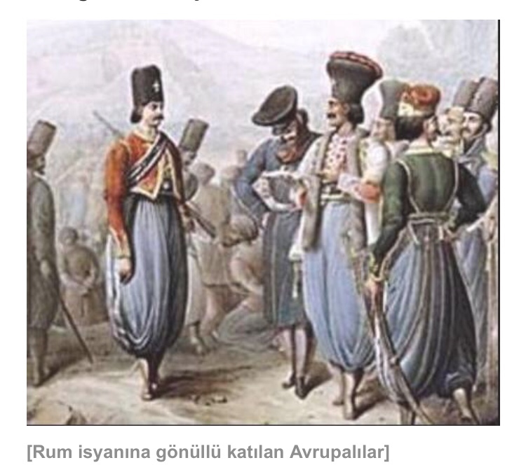 “Avrupa’da sahip oldukları uygarlığın kültürel ve laik köklerinin Antik Yunanistan’dan kaynaklandığı tezi kabul görüyordu. Her rütbeden subaylar ve halk gönüllü yazılıyordu. Başta İngiltere olmak üzere Avrupa’nın pek çok yerinde kurulan komiteler para topluyor, isyana fiilen katılan gönüllü gruplar Mora’ya akın ediyordu. New York gibi büyük şehirlerde para ve mühimmat yardımları toplanıyor, gönüllülerle birlikte isyan bölgesine gönderiliyordu.”