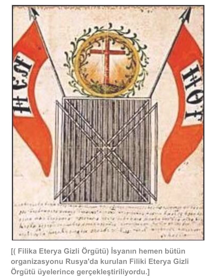 [( Filika Eterya Gizli Örgütü) İsyanın hemen bütün organizasyonu Rusya’da kurulan Filiki Eterya Gizli Örgütü üyelerince gerçekleştiriliyordu.]