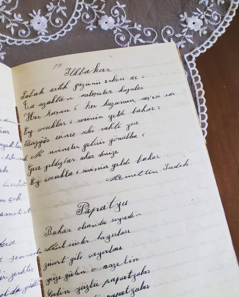 ( Fotoğraf : Anneannemin 13 yaşındayken tuttuğu şiir defteri. Soyadı kanunu çıkmadan önce yazmış, çünkü şairler hep isimle anılıyor. Muhtemelen Türk Dil Kurumu’nun kurulduğu ilk yıllardan…O yaşta bir genç kızın yazısına ve özenine hayran olmamak mümkün mü? )